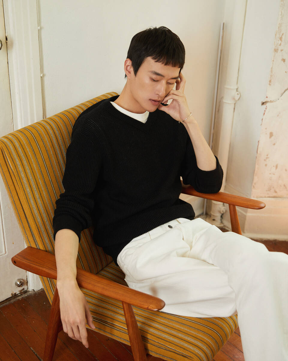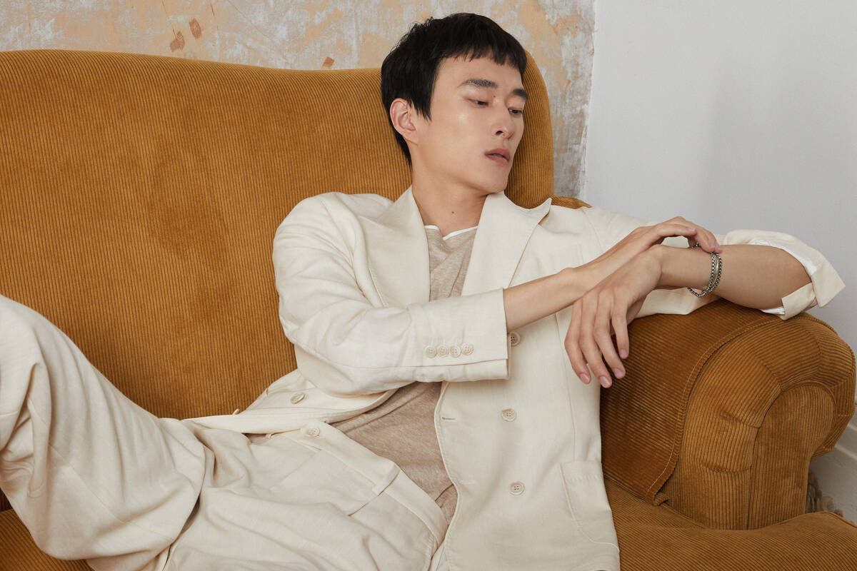 换上了一套简约的同色系装扮,他慵懒地躺在沙发上,手指不自觉地摆弄着腕上的手链,表现出期待与犹豫。