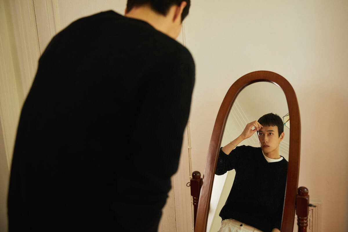 走到镜子面前, Alex不停地更换站姿,轻拨着头发,开始仔细地审视自己的每一个细节。