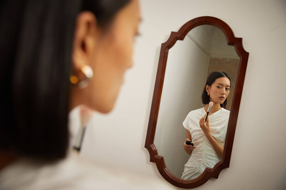Jessie站在镜子前,拿起化妆品,轻轻地试着不同的妆容。