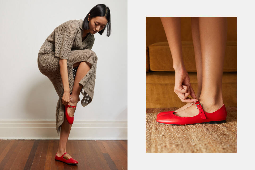 她走到鞋柜前,目光在那些鞋子间游移。最终,她的手停在了一双平底红鞋上。