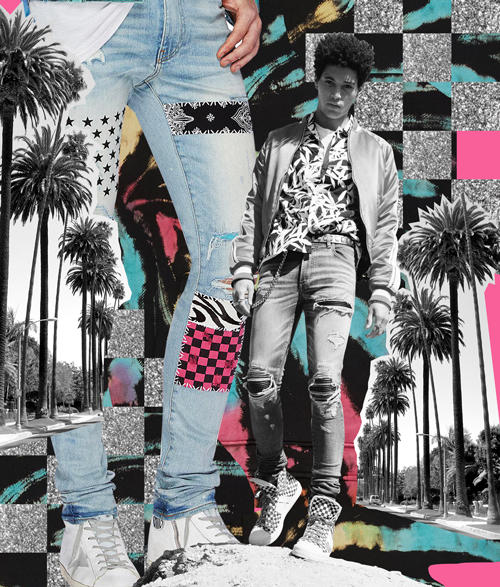 经典的洛杉矶摇滚造型近来被注入奢华元素,Mike Amiri 的同名品牌创立仅仅数年,已收获众多社交媒体忠实粉丝和个性顾客的簇拥,渐渐成为热门潮流品牌。这个连知名好莱坞明星 Justin Bieber 和 Kanye West 也喜欢的品牌,推出充满洛杉矶街头风格的帅气产品,有破洞牛仔裤、皮革夹克、图案 T 恤和做旧材质。