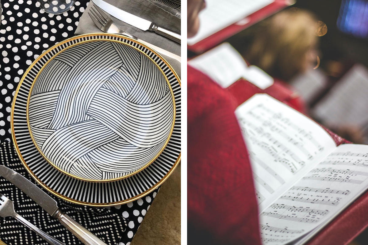 “去年我们邀请了 14 位客人来吃晚餐,因此非常忙碌。我们唱起了威尔士赞美诗并玩起了桌游——我和我儿子 Cian 是看图说话的梦之队。去年我们用一个装满了糖果的皮纳塔蛋糕来开场。我丈夫担任主厨,而在这一天到来前我们会对菜单进行长达数月的打磨。我会用 Lustre 餐具系列来摆好桌子。这套白色底色的餐具上凸显了黑色和 24K 金手绘帆船图案,因此定下了我们的色彩主题——白色、黑色和金色,以及特别为圣诞节推出的红色和绿色。黄铜大烛台作为餐桌的中心摆件——并在四周洒上我们从附近公园里捡来的树叶和莓果。Massimo 会预先准备好主菜,而那天下午朋友们也会帮忙做出新的菜式,我们休闲随性的圣诞午餐通常会持续至晚餐时分。歌单里会包含威尔士赞美诗、上世纪 80 年代的经典老歌,音乐让宾客们宾至如归——我们甚至会为芬兰的朋友准备芬兰风情的歌单!”