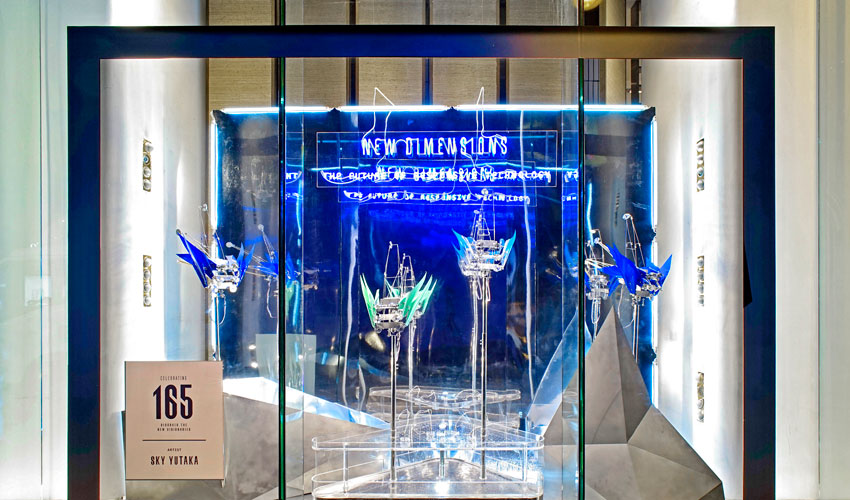 为庆祝连卡佛成立 165 周年,创意设计工作室 Sky Yutaka 特别创作了一组令人耳目一新的橱窗装置,带您进入一个由机械打造的未来美丽新“视”界。