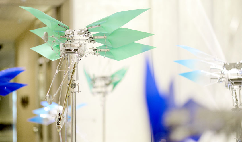 于是,设计师们从水入手不断尝试、探索和修正,最终制作出了一个以水流传感器和反射玻璃面板结合而成的模拟降雨装置,“雨点”洒落在机械花朵上,通过平衡砝码操控花瓣的开合。