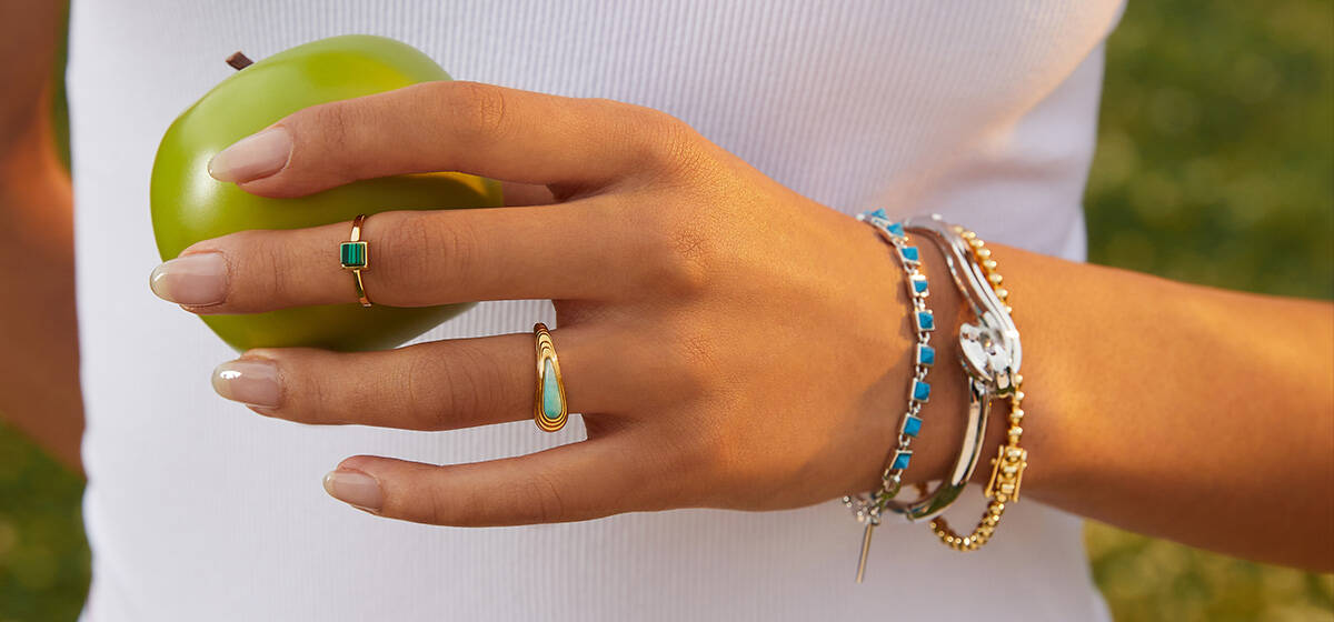 夏日里,色彩越丰富越好。你可以选择彩色宝石戒指,搭配金属复古戒指、珍珠,或者是Y2K风格的珠串琉璃戒指。就像用不同的戒指组成你的乐队,在指尖上演奏。因为可以根据个人的审美和个性自由搭配,轻松就能玩转时尚感穿搭。