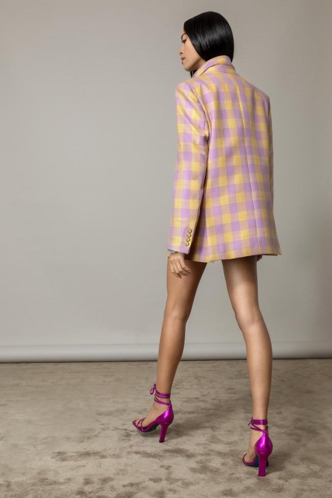 从 80 年代借鉴而来的一股潮流——四四方方的宽松型西装外套——很快就会风靡四处。Blazé Milano 特别推出了仅连卡佛有售的经典“Everynight”版型淡紫色和黄色拼色格纹西装外套。