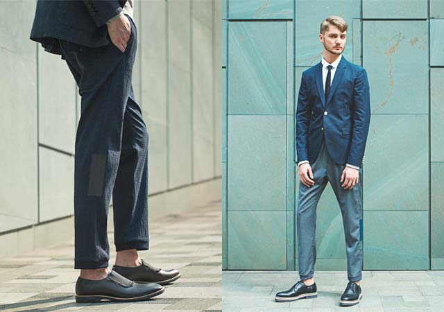 左:Lardini 两面穿西服外套、Rag & Bone 混色卫衣、Mauro Grifoni 皱褶感格纹休闲长裤及Maison Margiela 真皮平底鞋