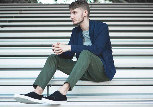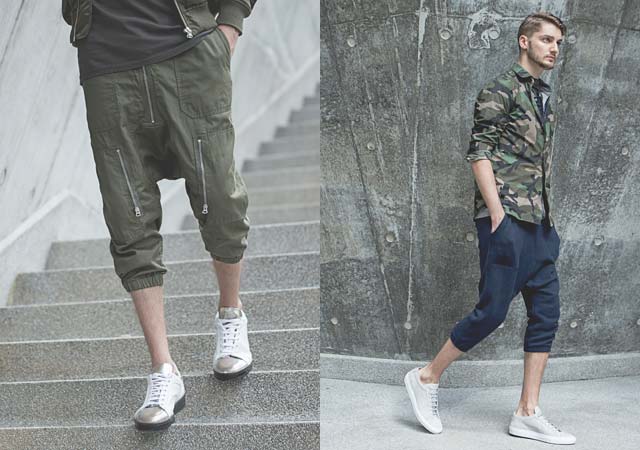 中:Kitsuné 纯色飞行员夹克、Drkshdw by Rick Owens 缝线装饰纯棉T恤、NLST 束绳弹力七分裤及Alexander McQueen 裂纹金属真皮拼贴运动鞋