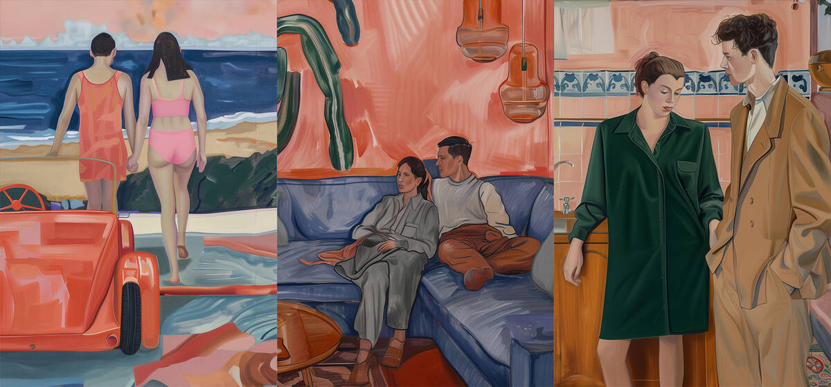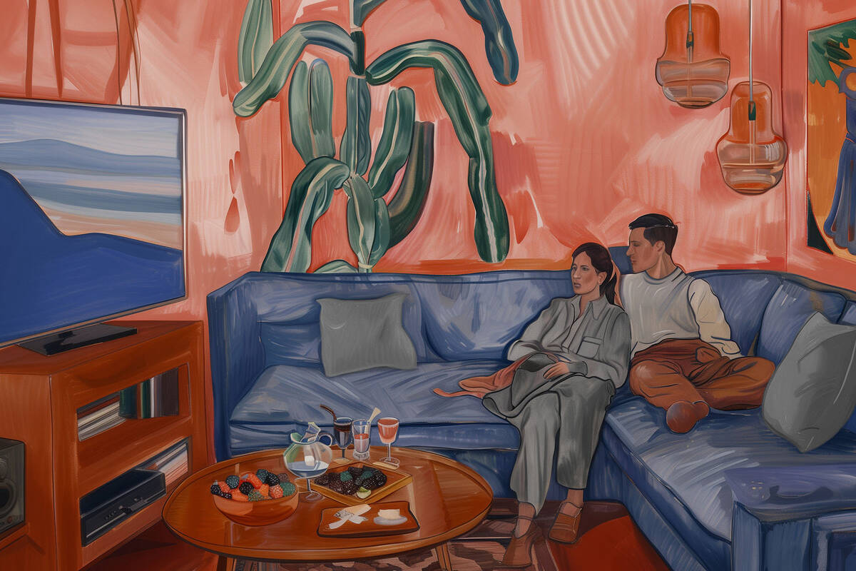 一起懒洋洋地依偎在沙发上,紧贴在一起,享受二人世界。用一件舒适的披肩、滑面缎绸睡衣和一个柔软的靠枕,营造一个亲密或温馨的氛围。在这个舒服的空间里,轻柔地为对方整理发丝,轻抚背部、牵手、拥抱,感受彼此的体温和心跳。