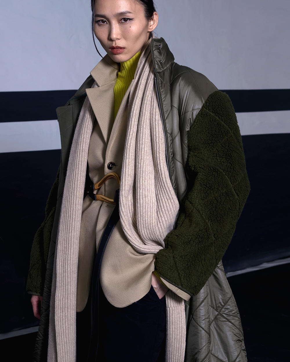 + JOSEPH 美丽诺羊毛针织围巾 立即选购 + BOTTEGA VENETA HORSEBIT几何造型搭扣双层真皮腰带 立即选购 + PORTSPURE 抓绒双袖拼接绗缝填充长款大衣 立即选购 + BOTTEGA VENETA 微透视高领真丝针织衫 立即选购 用超长围巾留住温暖 无论是盘绕在脖子上或是随意垂下,超长围巾会以互补的色调和温暖的质地丰富你的秋冬穿搭,与此同时还可以夸张的比例抵消衣物的臃肿感。 立即选购以下款式,助你打造秋冬造型。