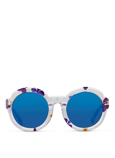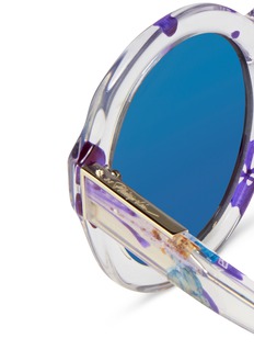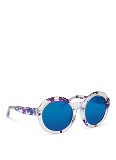 3.1菲利林由服装至配饰均糅合休闲及奢华感,备受当代女性喜爱。这款太阳眼镜大胆采用透明板材演绎摩登风格,缀以浪漫和谐的紫、蓝及米色花卉图案,显得格外清新怡人,圆框款式配衬蓝色镜片,瞬间点亮您的时尚不凡的个性造型。