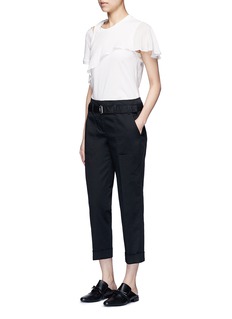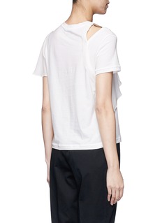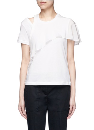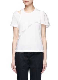 3.1菲利林这款T恤以独特的不对称剪裁吸引您的目光,一层飘逸顺滑的真丝荷叶边由左袖延伸至右边腋下,与右肩的层叠镂空设计相辉映,边缘缀以不修边的真丝点缀,随性中透出优雅清新格调。