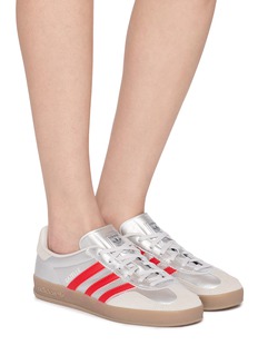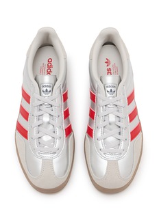 Embrace the classic charm of adidas' Gazelle sneakers. These iconic shoes are crafted with a smooth white leather upper, accented by adidas' signature three stripes in a bold red, providing a sharp contrast that's visually appealing. The Gazelle branding near the lace-up adds a touch of authentic heritage.
