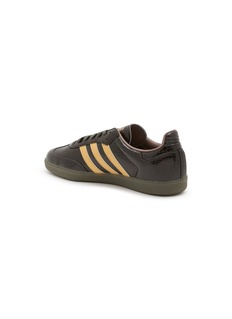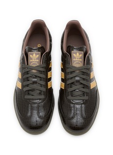 Elevate your streetwear with adidas Samba sneakers, crafted from exquisite crocodile-effect leather in a versatile black hue. These sneakers feature the iconic three-stripe design in a striking gold tone, offering a luxe contrast. Engineered with a durable rubber outsole for superior traction, they seamlessly blend high-end aesthetics with practical everyday wear.