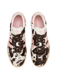 Step out in style with adidas' Samba sneakers, reimagined in a bold cow print that's sure to turn heads. These sneakers feature a monochrome cow print paired with soft pink stripes, adding a pop of colour and feminine charm to the classic silhouette. Crafted with a soft hair-on-hide upper and a durable gum sole, these shoes combine comfort with edgy aesthetics.