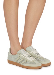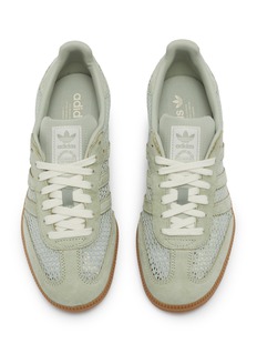 The adidas Samba gets a fresh lift in this reimagined icon. Its unique woven knit upper features adidas' signature serrated three-stripes for an elevated, tactile look. Suede toe detailing and a gum sole blend vintage charm with modern street style. Designed for all-day wear, these Sambas offer a versatile, elevated look — whether styled with tailored separates or relaxed denim.
