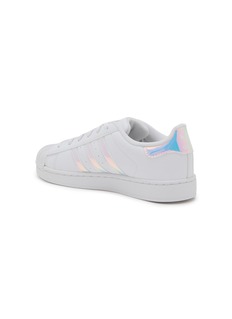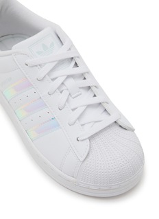 A cheerful interpretation of the iconic Superstar featuring metallic stripes and a playful heel tab. The pristine white palette ensures effortless outfit matching while maintaining the classic silhouette's charm.
