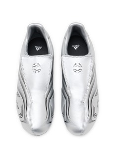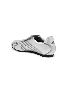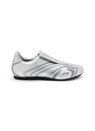 adidas presents the futuristic +F50 sneakers with a revolutionary laceless slip-on design and aerodynamic ribbed sculpting across the upper for streamlined performance. The molded construction with "+F50" branding and contoured lines reflects speed-focused engineering, while the grippy flat sole delivers precision control for athletic pursuits.