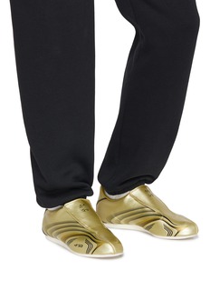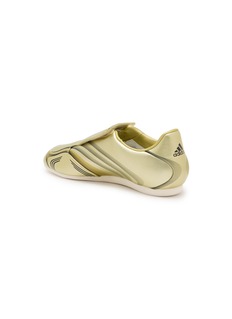 adidas reimagines the iconic +F50 with a sleek laceless silhouette featuring aerodynamic contoured ridges that flow across the upper for reduced drag. The hook-and-loop closure strap ensures secure fit, while the molded construction and "+F50" branding pay homage to football heritage. A minimalist flat sole completes the speed-inspired design.
