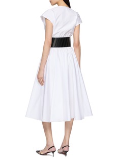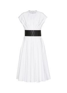Alaïa 注重几何形状和线条的处理,以巧妙的轮廓剪裁来勾勒身体的曲线。这款连衣裙以府绸面料勾勒利落廓形,宽腰带修饰身形线条,更融合简洁质感与摩登格调。