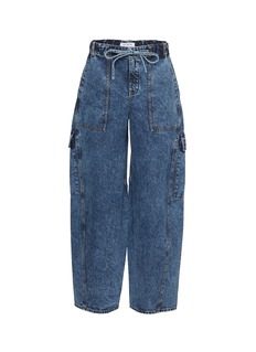 Alaïa 这款工装裤以水洗蓝牛仔面料为基底,阔腿版型注入松弛气场,抽绳腰头和多口袋设计兼顾随性与实用,适配日常出街、轻休闲等场景。搭简约白 T 解锁街头松弛感,配精致上衣衬出复古反差,是兼具工装风格与高级质感的个性单品。