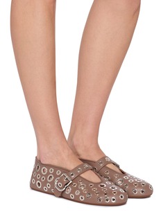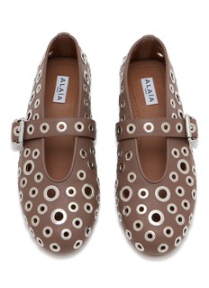 Alaïa 来自摩洛哥,作品常以优雅、性感和力量感为着点,用精湛的工艺打造出雕塑性魅力。这款平底鞋以金属孔眼带来摩登格调,经典玛丽珍扣带设计,更添利落复古俏皮魅力。