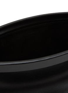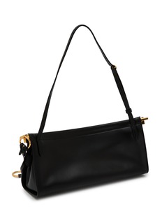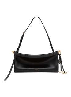 Alaïa 的 Le Click East West 手袋采用质感皮革制成,其弧形轮廓、皮革包裹的铰链开口和建筑风格的底部褶皱唤起了雕塑般的优雅。饰有金属环系细节和可调节肩带,可轻松单肩或斜挎。