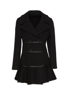 Alaïa 注重几何形状和线条的处理,以巧妙的轮廓剪裁来勾勒身体的曲线。这件大衣用细腻挺括面料打造,双排扣设计兼具气场与复古感,皮质饰条收腰优化比例,荷叶边裙摆增添女性化细节,适配多场景。