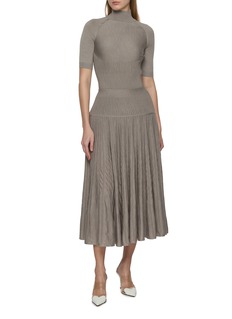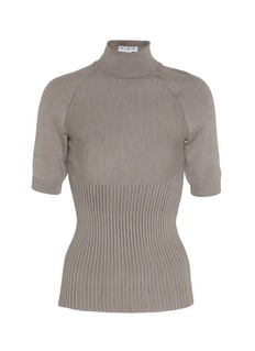Alaïa 以线条与肌理塑型,勾勒身体的精致曲线。这款针织上衣以高领收束颈部轮廓,拼接罗纹描摹腰肢线条,半袖版型平衡轻盈,搭配利落裤装,演绎知性的摩登质感。