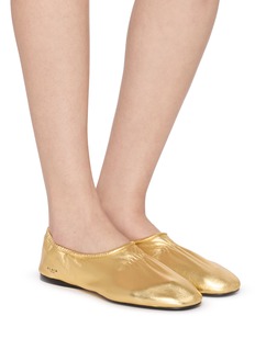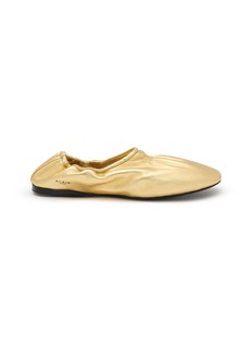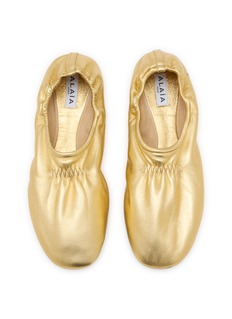 Alaïa 以雕塑感皮革工艺重塑芭蕾鞋,这件单品选用金属光泽的层压纳帕皮,鞋身自然褶皱如第二层肌肤,方头线条利落而不失柔美,是晚装与日常造型的点睛之笔。