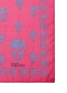 亚历山大麦昆在优雅与暗黑风格之间寻找平衡,这款围巾选用成熟夺目的红色真丝雪纺面料,上面印有品牌经典的深蓝色骷髅头图案,颇具视觉冲击,令您的造型典雅中不乏叛逆个性。
