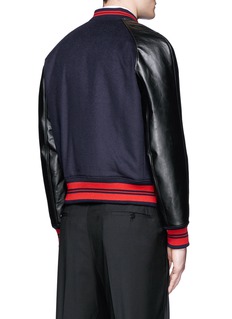 棒球夹克是换季的百搭单品。亚历山大麦昆这款以深蓝色羊毛混羊绒面料拼红色条纹组成,透出淡淡的学院风格,与衣袖的黑色牛皮形成硬朗对比,配以左胸的仿水晶及骷髅头刺绣拼贴,让您的造型更独特注目。
