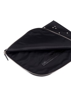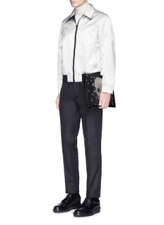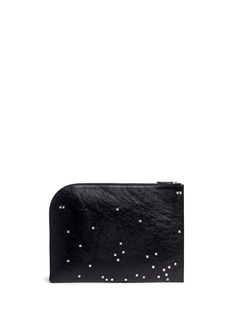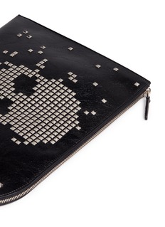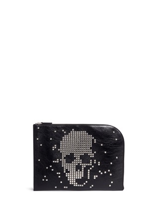 经典的骷髅图案每一季都以不同形式出现在亚历山大麦昆的皮具和服饰上,这款手拿包以银色铆钉制作出像素效果的骷髅图案,配合黑色纹理牛皮,打造出抢眼的摇滚风范。顺滑银色金属拉链开合方便,适宜的容量让您妥善放置随身物品,是出席派对或逛街时的点睛单品。