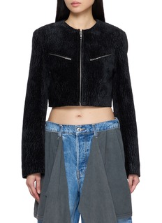 alexanderwang 凭借不拘一格的都市美学,将精致、简洁、舒适和强烈的个人风格相结合。这款夹克采用挺括面料打造立体廓形,短款剪裁利落干练,肩部略宽设计营造出中性风格的力量感。