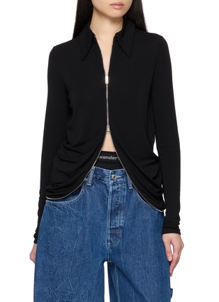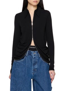 Fluid crepe jersey defines this shirt, where soft gathering at the back is traced by a continuous metal zip running from front to back. The low-hip silhouette balances precision and movement—wear it zipped high for polish or slightly open for a relaxed edge.