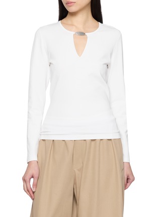 alexanderwang 这款修身套头衫采用哑光针织面料,勾勒流畅身形曲线,带来如第二层肌肤般的顺滑触感。简洁的 V 形开衩领口点缀着抛光金属标牌,为日常造型注入锐利现代感,将简约风格升华至摩登境界。