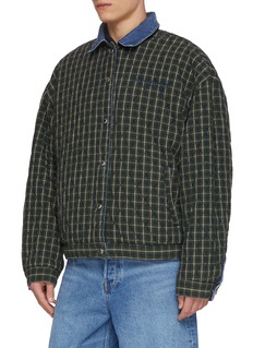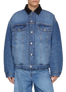 alexanderwang 以美式复古风格诠释街头美学,这款夹克一面是水洗牛仔的随性做旧感,另一面是格纹内衬的复古氛围,灯芯绒翻领更添细节层次。双面设计可随心切换风格,搭配阔腿牛仔裤,轻松打造随性又潮酷的全丹宁造型。