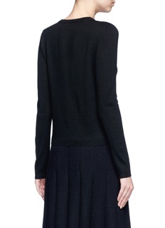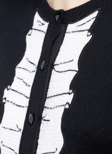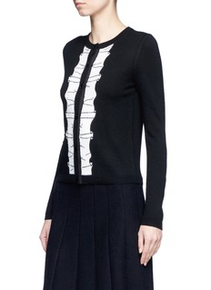 珠饰及亮片是爱丽丝+奥丽维亚今季常见的点缀。这款柔软透气的羊毛针织外套以黑色为主调,开襟旁缀以白色波浪条纹,并通过透明亮片带出光泽感,配以别致的黑色锥形钮扣,释放出年轻的甜美活力。