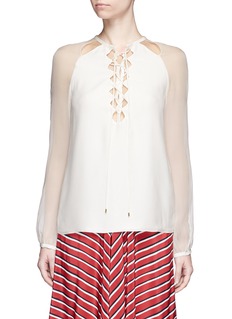 Altuzarra这款上衣采用羊毛混棉面料拼接雪纺制造,让白色设计呈现出平顺与透薄的对比。由领口延至胸前的交叉系带与肩处的镂空点缀,透出一丝优雅妩媚,简约之中尽显用心细节。