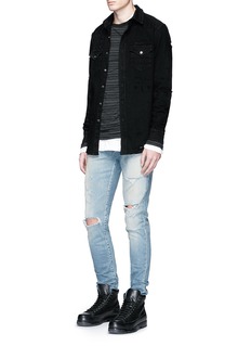 这款Amiri的衬衫以近季流行的牛仔布裁制,富弹性的设计让你伸展轻松自如,黑色表面满布大小磨破装饰,别具粗犷颓废气息,加上亮眼的银色钮扣,是打造暗黑前卫风格的理想之选。