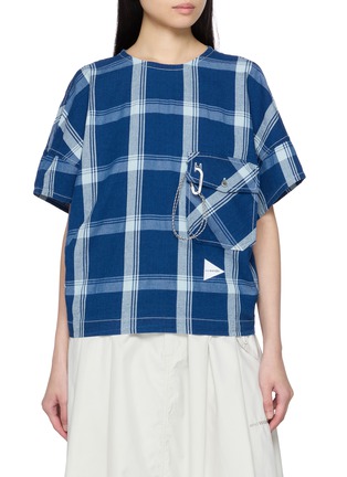 AND WANDER's oversized top features a bold check pattern with contrast topstitching and a distinctive chain-detail chest pocket. The boxy silhouette with dropped shoulders offers relaxed comfort and contemporary styling. A versatile technical piece that transitions effortlessly from outdoor adventures to urban settings.
