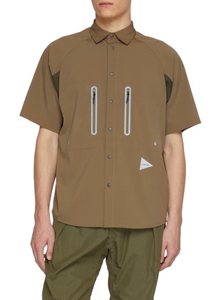 AND WANDER's technical shirt features contrast-trimmed zip chest pockets and raglan sleeves with panel inserts for enhanced mobility. The relaxed short-sleeve silhouette combines functional snap-button closure with ventilated design details, merging workwear aesthetics with performance innovation. A versatile piece that transitions seamlessly from trail to city.