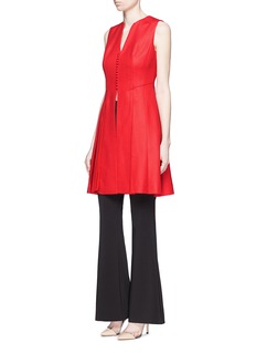 女星刘嘉玲于2015年创立了自己的服装及配饰品牌 ANIRAC,主打法式优雅风格。春夏系列灵感来自19世纪英国爱德华时代的王室贵族打扮,别致独特的钮扣元素成为了系列重点。这款羊毛背心剪裁简洁合身,百褶装饰裙摆拼接垂褶真丝雪纺面料,散发高贵浪漫气息,衣襟加入点睛的包布钮扣点缀,为纯色设计带来时尚活力,彰显都市女性知性大方的一面。