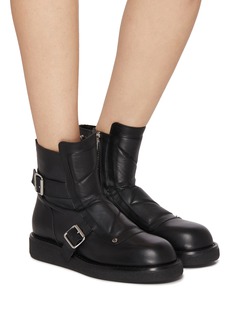 Ann Demeulemeester 这款短靴精选真皮呈现出富有线条美感的挺括廓形,金属搭扣缀饰更添帅气细节,为你的都市女郎造型注入不羁街头格调。
