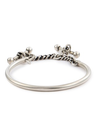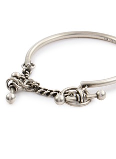 This Ann Demeulemeester bracelet showcases a fusion of rustic charm and modern design. Crafted from high-quality metal, its unique structure features a smooth main band complemented by intricate, twisted accents and spherical details. The secure closure ensures a comfortable fit.