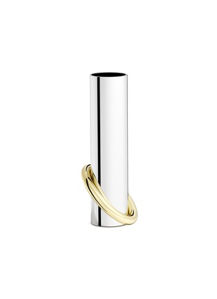 Our Ring Bud Vase is stable only when its gold-tone ring leans against its silver column — a visual metaphor for the importance of community. Crafted from stainless steel and solid brass, the bud vase adorns the table, creating a decorative and highly functional presentation of your blooms.