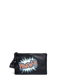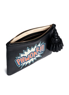 Inspired by Anya Hindmarch's fascination with daily lifestyle aesthetics and personalisations, this capra leather clutch is embossed with sticker-fixated caricatures and a scripted bubble for a fun-loving touch. Paired with the brand's signature Courtney tassel pull and garnering praise with exceptional craftsmanship, this accessory is a beautiful creation that makes styling effortless.