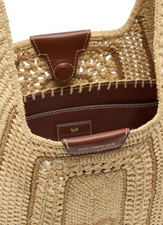 This slouchy hobo bag exemplifies Anya Hindmarch's artisanal craftsmanship with intricate hand-crocheted detailing in layered rectangular patterns. The relaxed silhouette features refined leather accents and an adjustable shoulder strap for comfortable all-day wear. A versatile bohemian-luxe piece that adds textural interest to any ensemble.