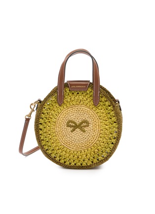 This charming circular crossbody showcases Anya Hindmarch's artisanal craftsmanship with intricate hand-crocheted detailing in concentric patterns and signature bow motif. The compact silhouette features dual leather top handles, a detachable adjustable strap, and contrast stitching for versatile styling. A perfectly proportioned piece that adds whimsical sophistication to day-to-night looks.