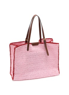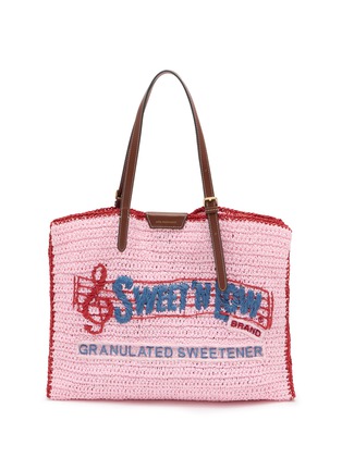 This whimsical tote showcases Anya Hindmarch's irreverent spirit with a vintage sweetener packet motif rendered in hand-crocheted detailing. The generously sized silhouette features contrasting leather straps and branded accents, combining nostalgic charm with artisanal craftsmanship. A collector's piece that injects playful personality into any wardrobe.